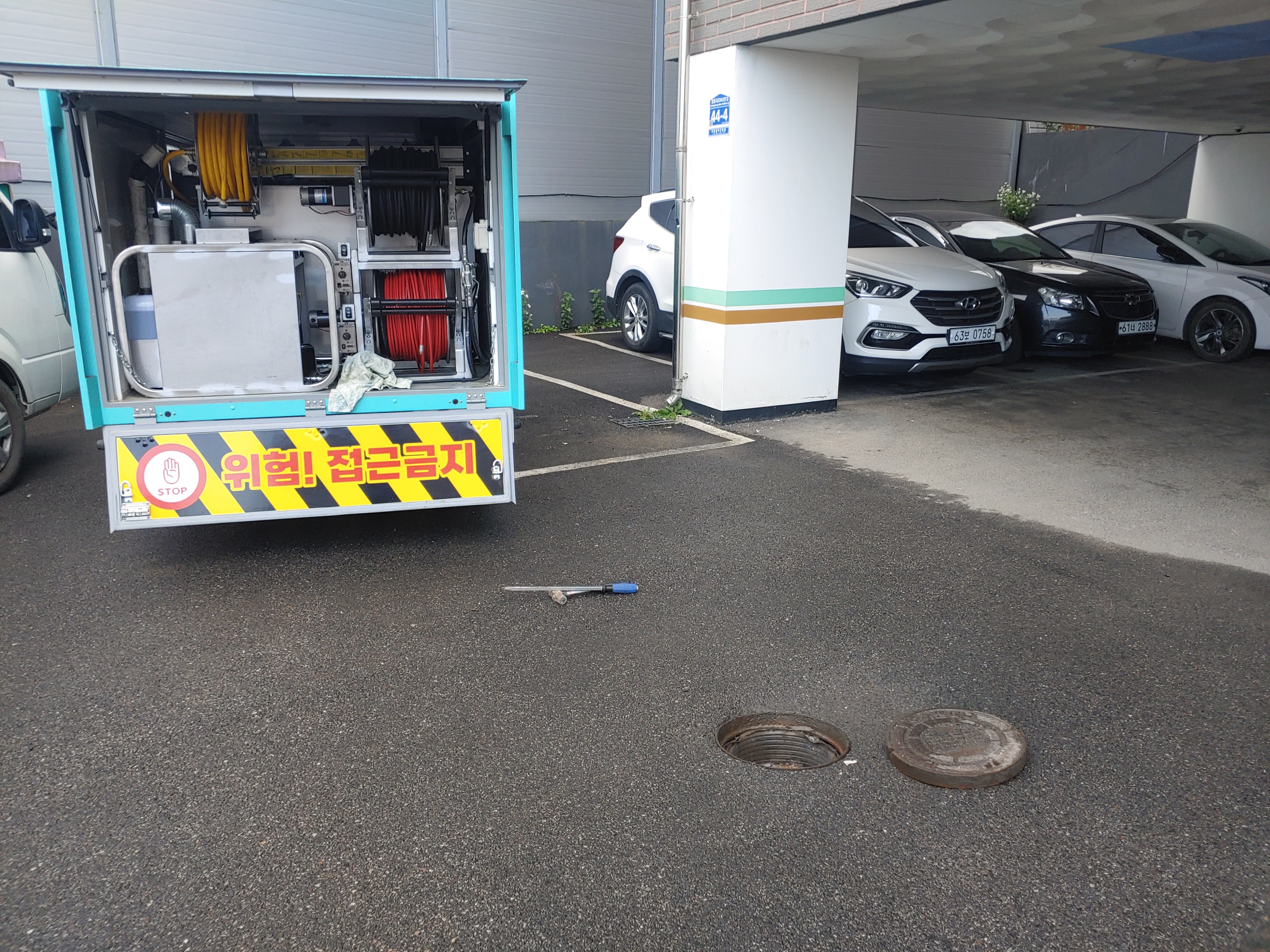 고압세척 장비를 이용해 약2시간에 걸쳐 작업을 진행했습니다. 그 결과 각종 찌꺼기와 이물질 들이 제거되었고 하수구배관은 마치 세것처럼 깨끗해졌습니다.