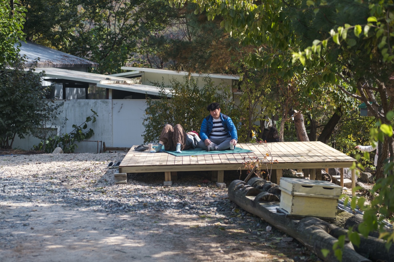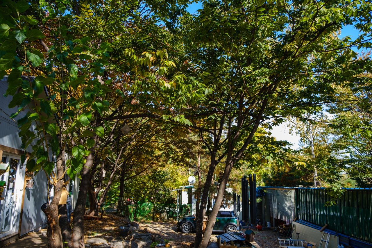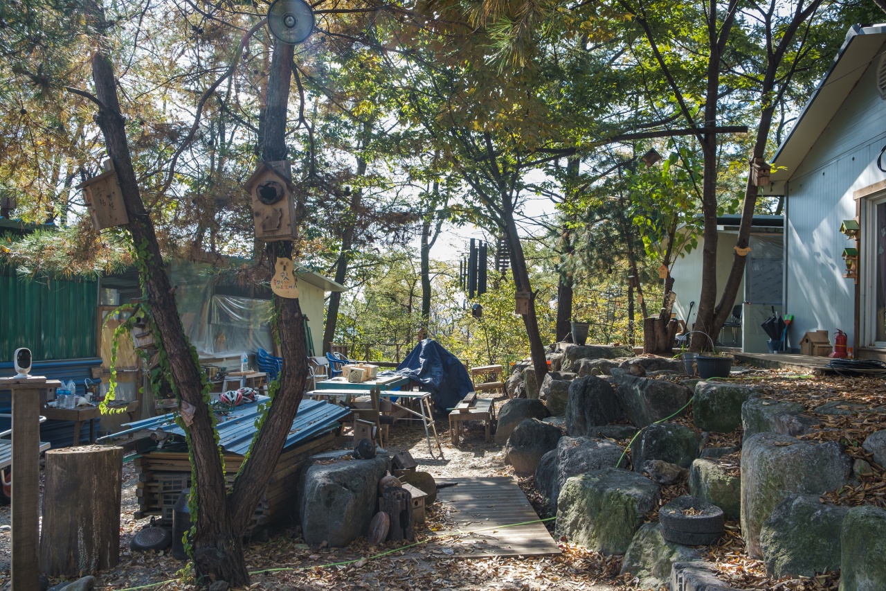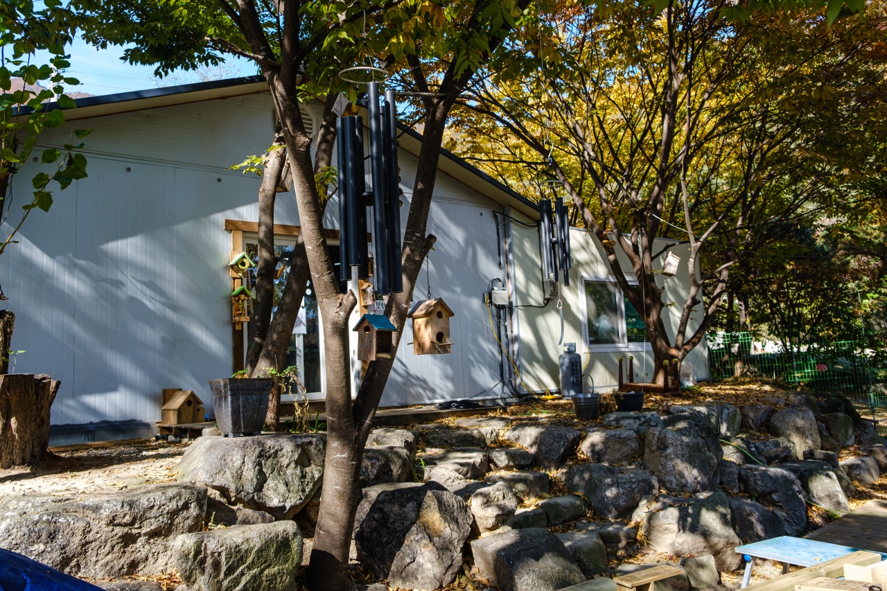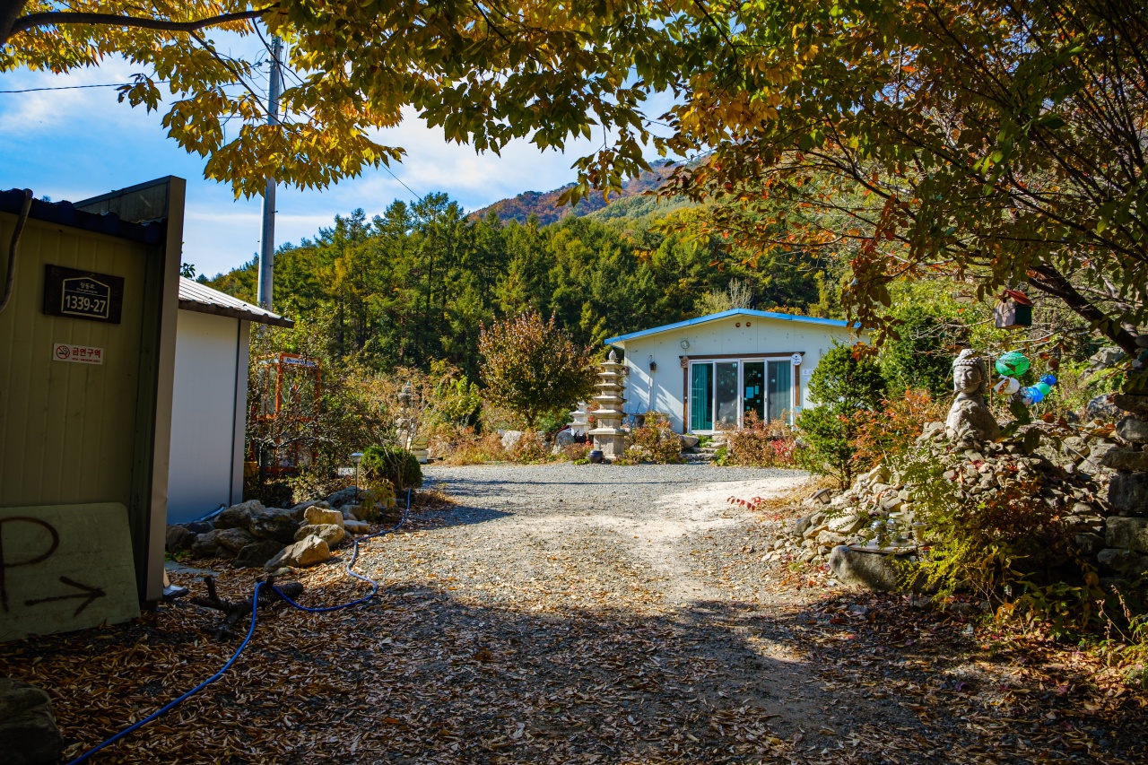 사진 오른쪽에 있는 건물은 스님의 목공공방입니다. 그리고 왼쪽에는 카페, 도서관, 체험장, 개수대 등등 메인건물이 자리잡고 있습니다.