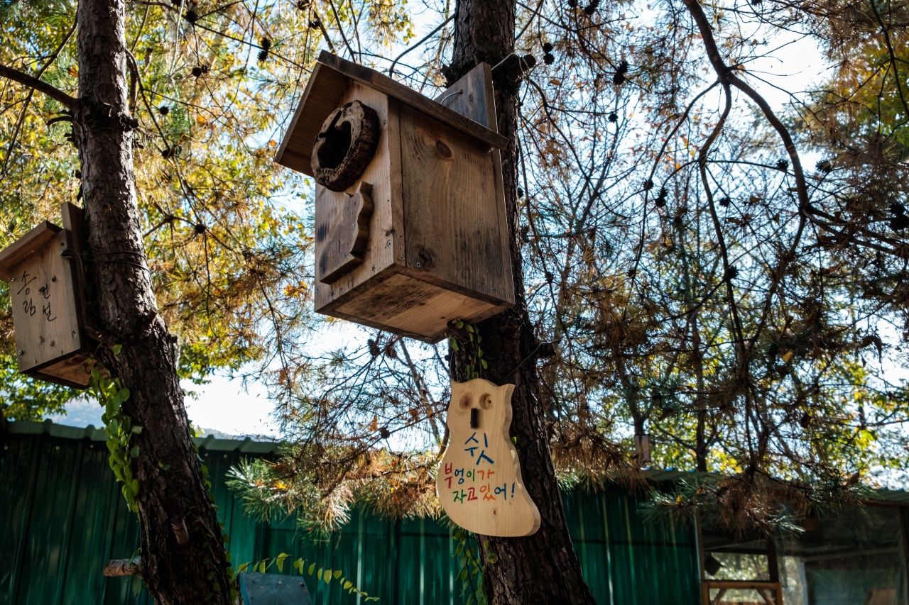 산새학교 캠핑장은 여기저기 새집이 나무에 걸려있는데요. 스님께서 직접 새집을 만들어서 걸어놓으셨더라구요.