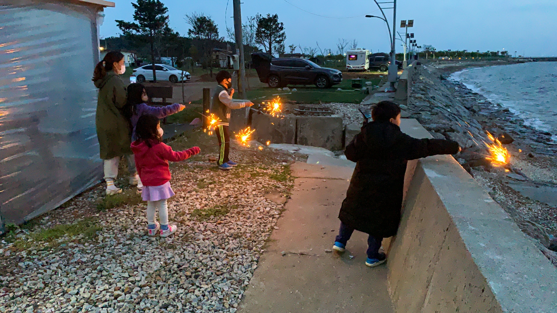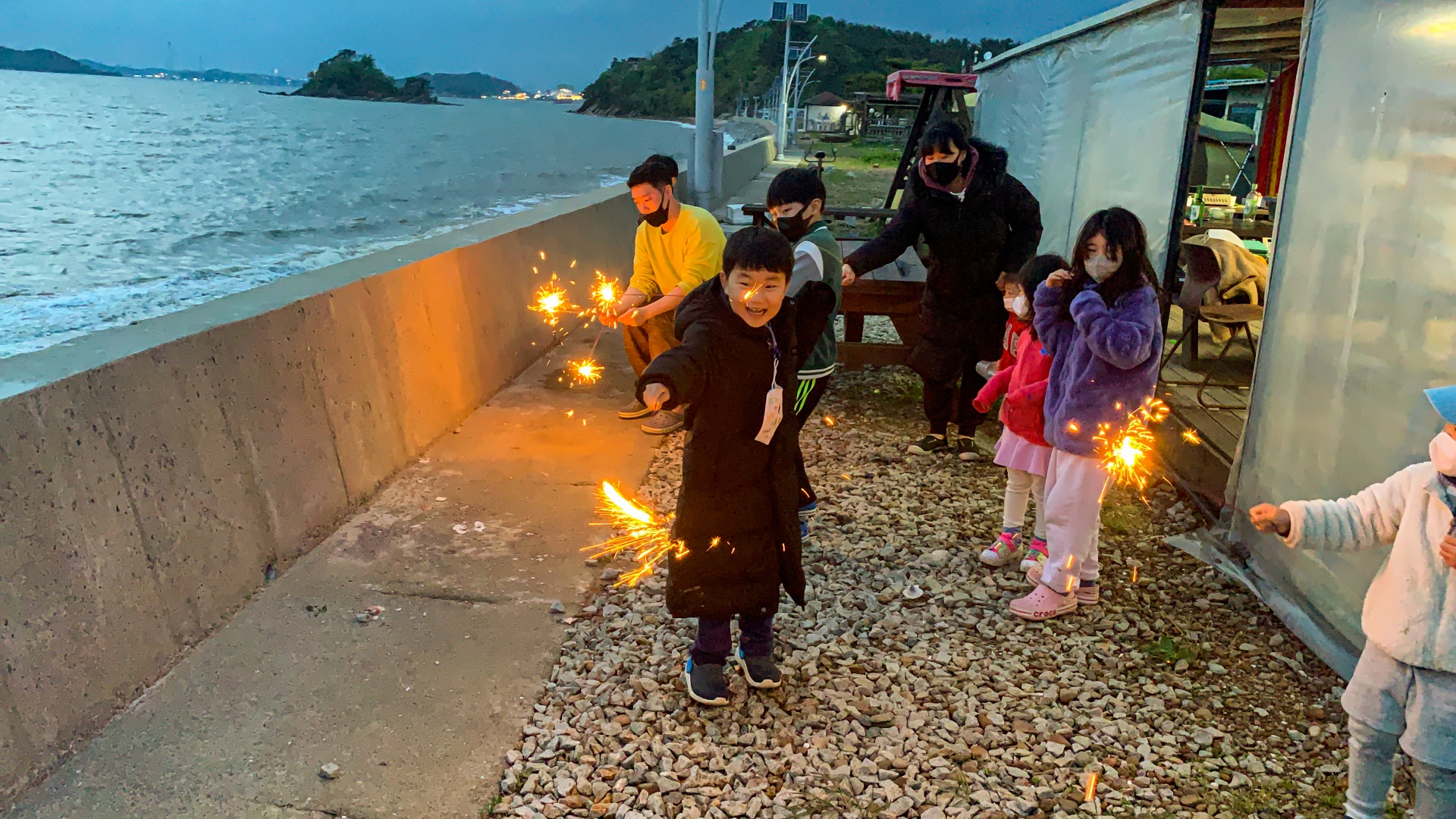 아이들이 행복해하는 모습이 담겨있습니다. 불꽃놀이를 마음껏 즐기고 싶다면 바닷가에 위치한 오토캠핑장을 추천합니다.