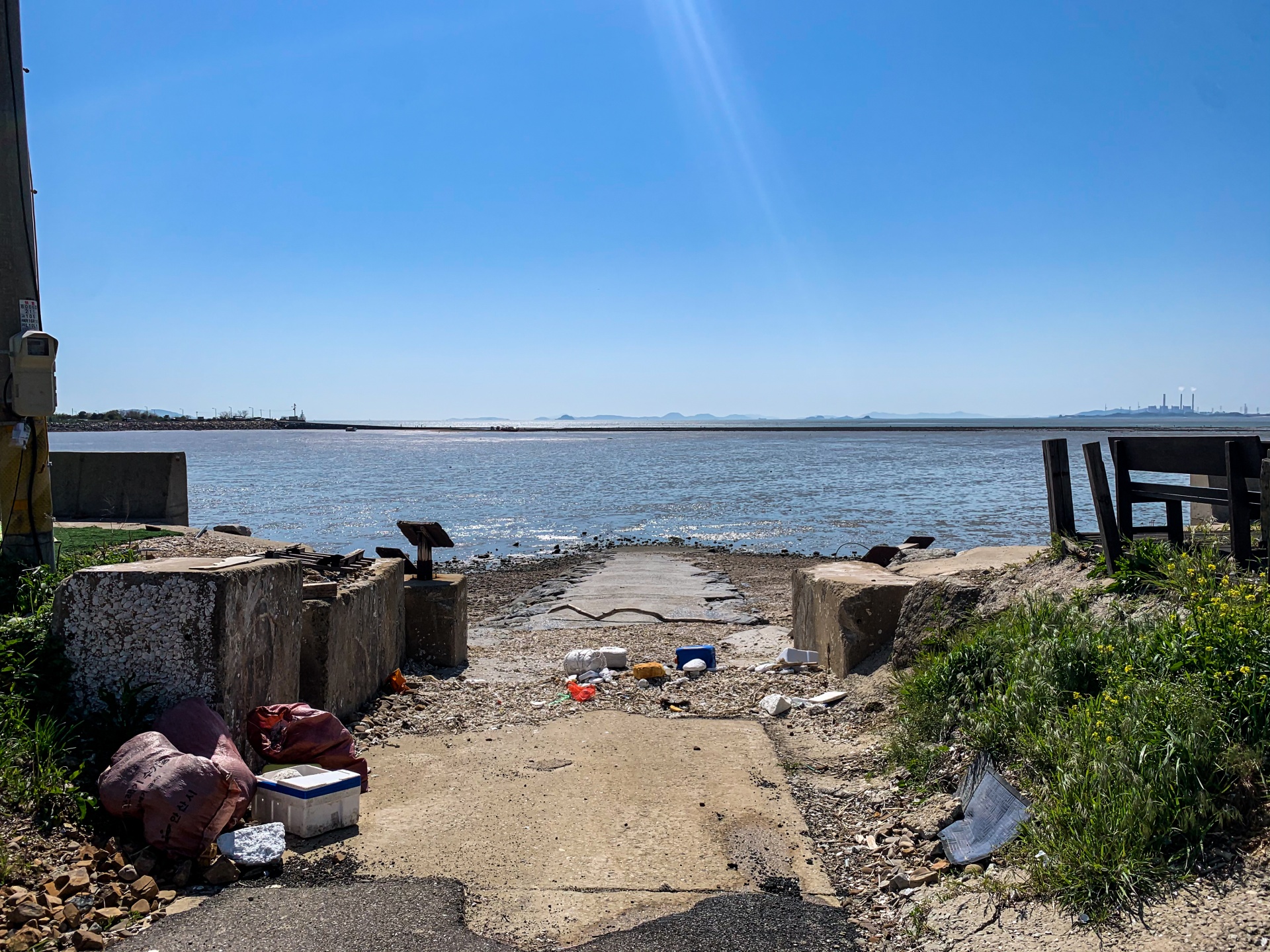 캠핑장 도착하자마자 자리잡은 사이트 앞에서 찍은 대부도 바닷가입니다. 바람이 엄청 불었는데 곧 있을 참사를 전혀 예상하지 못했습니다.
