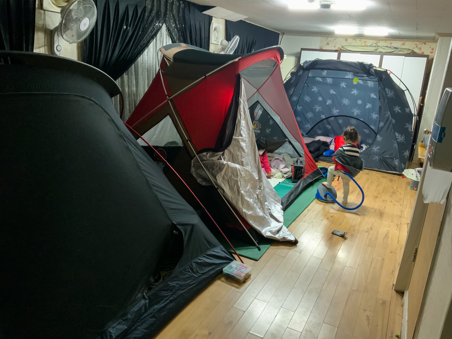 방이 좋은환경이 아니였고 조금이나마 캠핑분위기를 내기위해 방에다 텐트를 칩니다 ㅋ 3팀이 갔기때문에 텐트가 3동입니다. 방은 아주 넓직하더라구요. 잘 준비도 마쳤으니 신나게 먹습니다. 비와 바람이 엄청났기에 정신이 없어 사진은 한장도 없습니다.