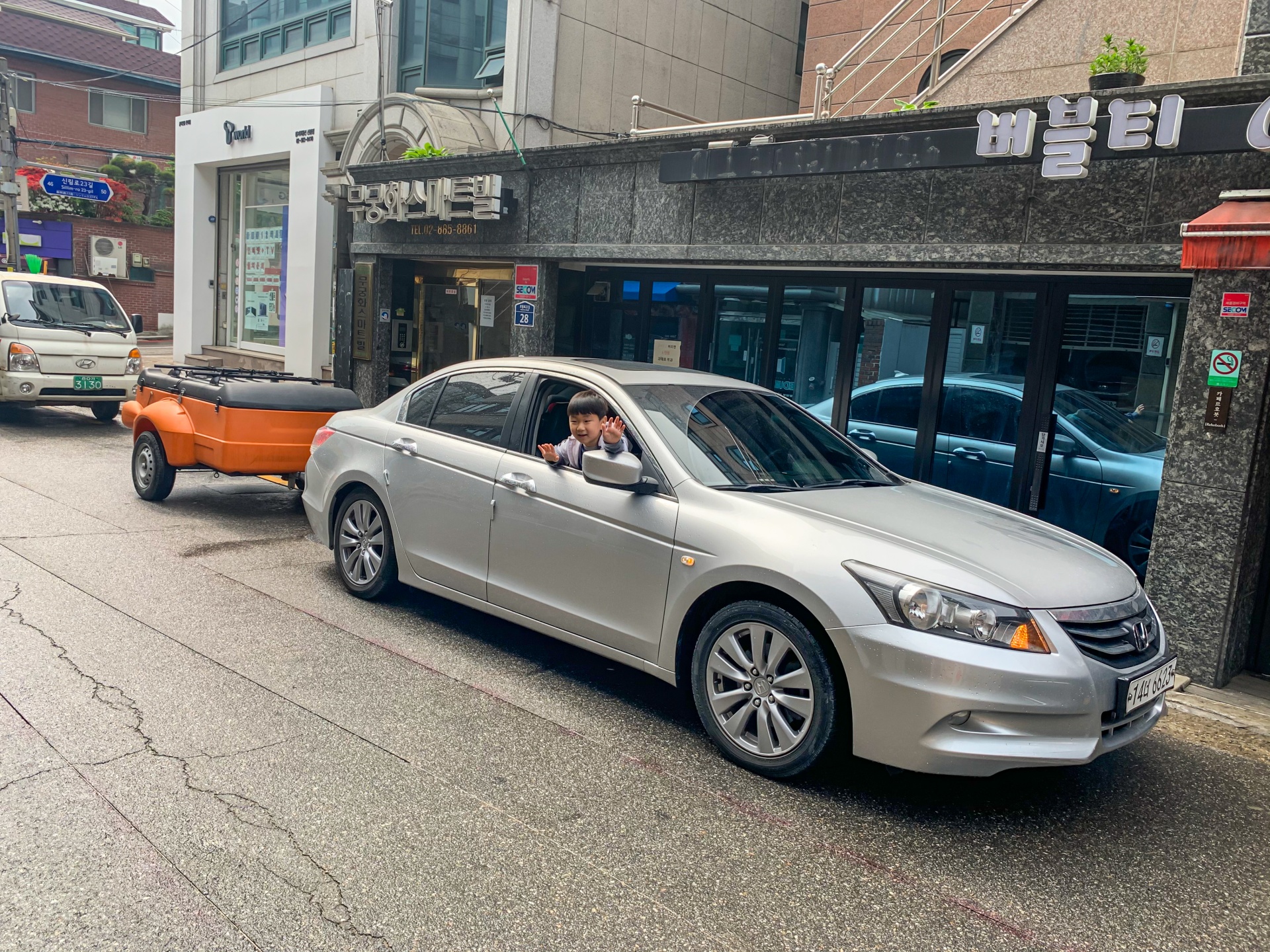 캠핑장으로 출발전에 동네 카페에서 커피를 사기위해 잠시 멈췄습니다. 2021년도 첫캠핑이니 인증샷하나 찍었습니다. 트레일러는 무사한데 추운겨울을 지낸 트레일러 안의 캠핑장비들이 무사한지 무진장 궁금합니다 ㅋ