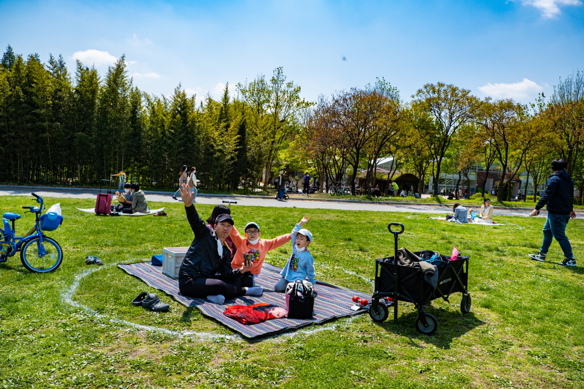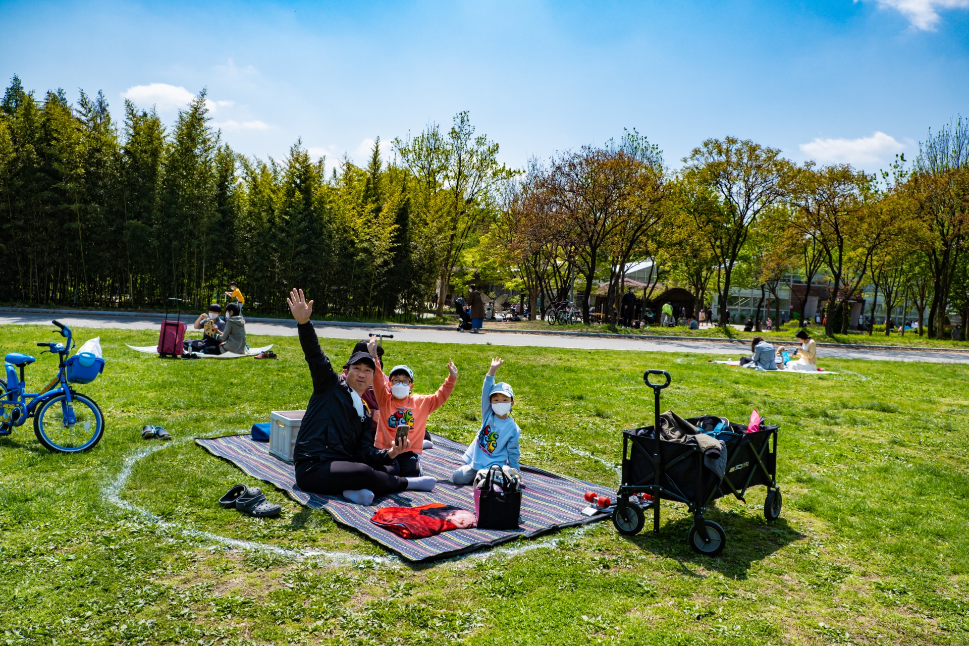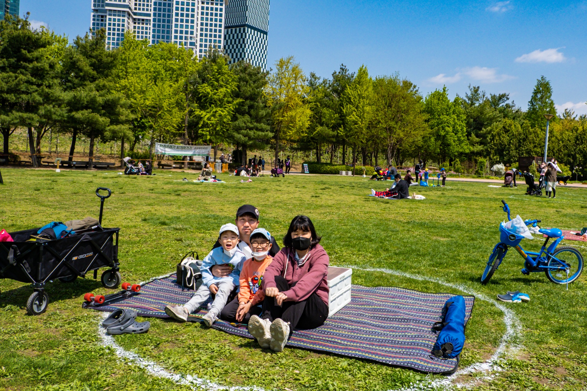 사회적거리두기 때문에 이렇게 원안에만 자리를 잡을 수 있도록 표시를 해뒀습니다. 다행히 자리가 금방 잡혔습니다. 나중엔 사진을 못찍을꺼 같아 초반에 가족하진 한장 찍었습니다.