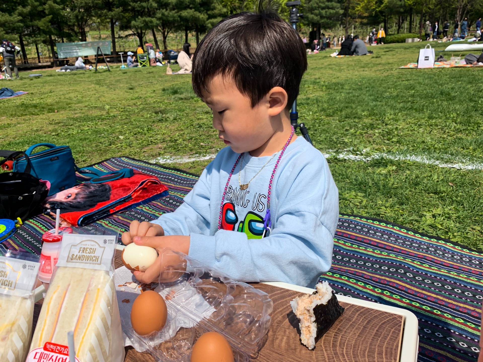 서울숲 안에 위치한 편의점에서 샌드위치와 우유, 반숙달걀을 사왔습니다.