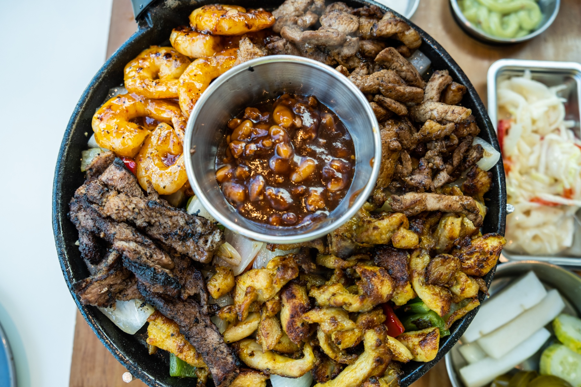4개지 고기가 종류별로 구워져있고 아래에는 여러가지 야채들이 세팅되어 있어 맛의 절묘한 조화를 이룹니다.