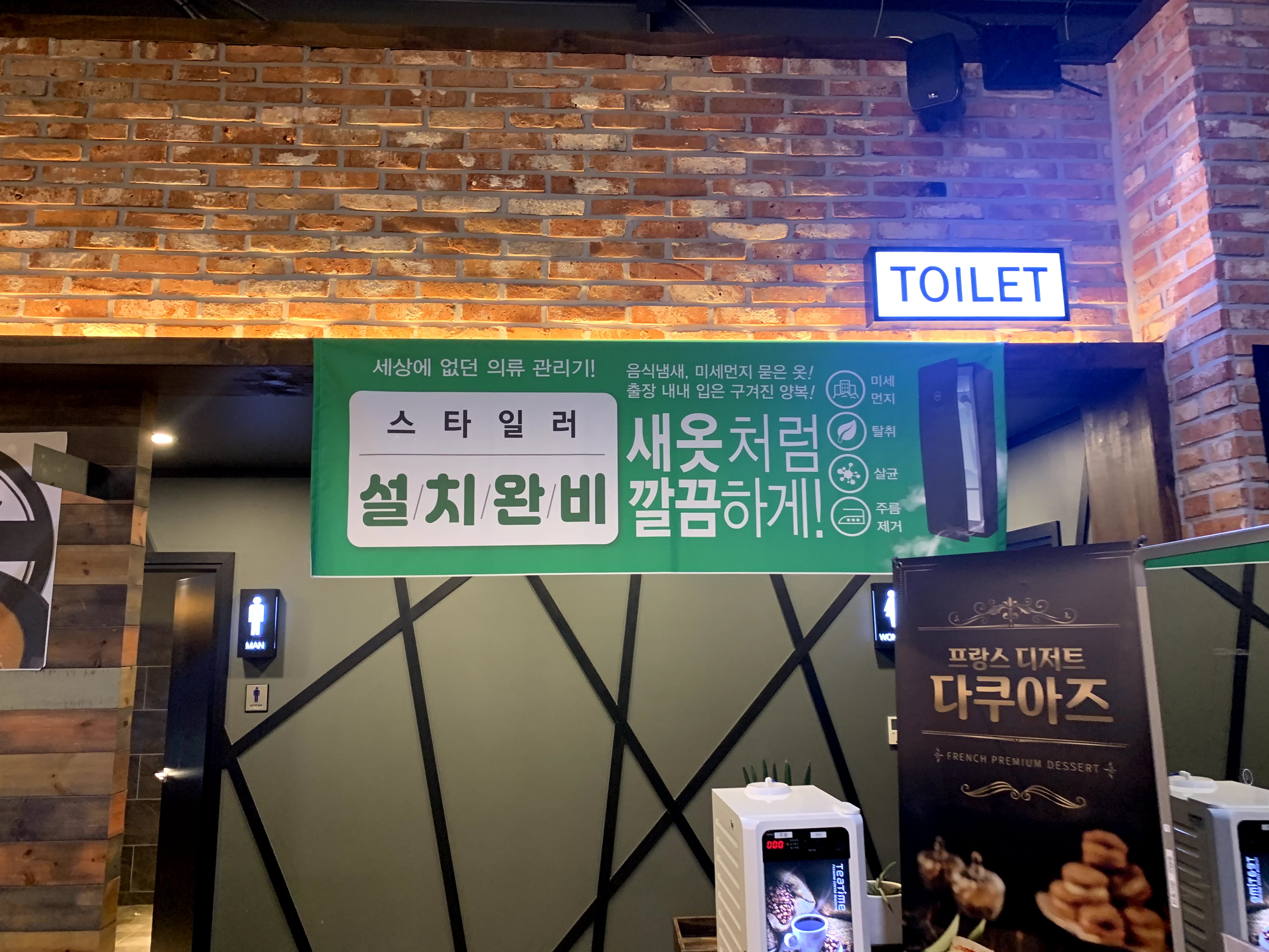 서울촌놈이라 이런것도 처음봅니다. 아무래도 숯불에 고기를 구워먹다보니 음식냄새가 옷에 밸 수 있으니 스타일러가 4대 설치되어있습니다. 정말 럭셔리하지 않나요? 구지 이렇게까지 하는 이유가 궁금하더라구요. 뭐 서비스와 차별화된 영업전략이겠죠?