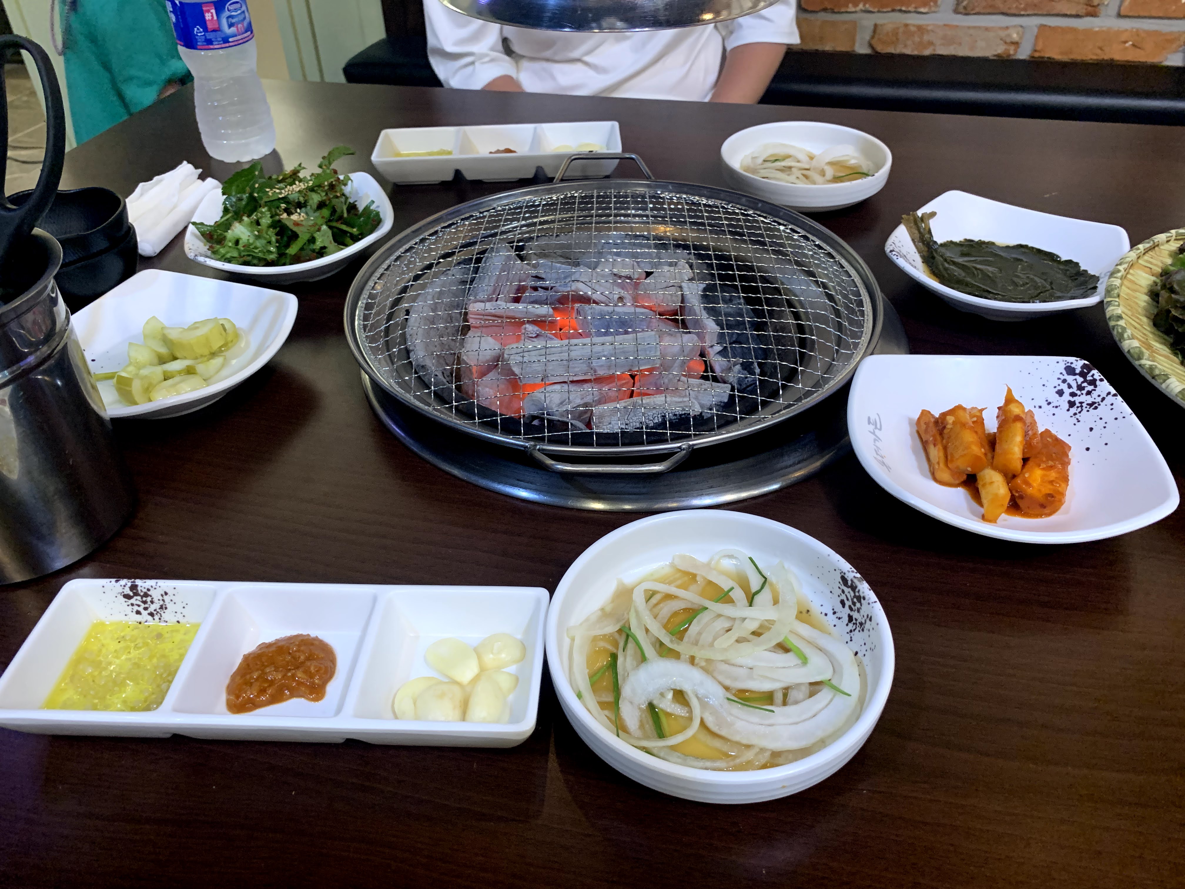 기본반찬이 놓여지고 숯불도 올려집니다. 뭐니뭐니해도 고기는 숯불에 구워먹는게 진리하고 생각하는 1인입니다. 반찬도 아주 깔끔하게 나오더라구요.