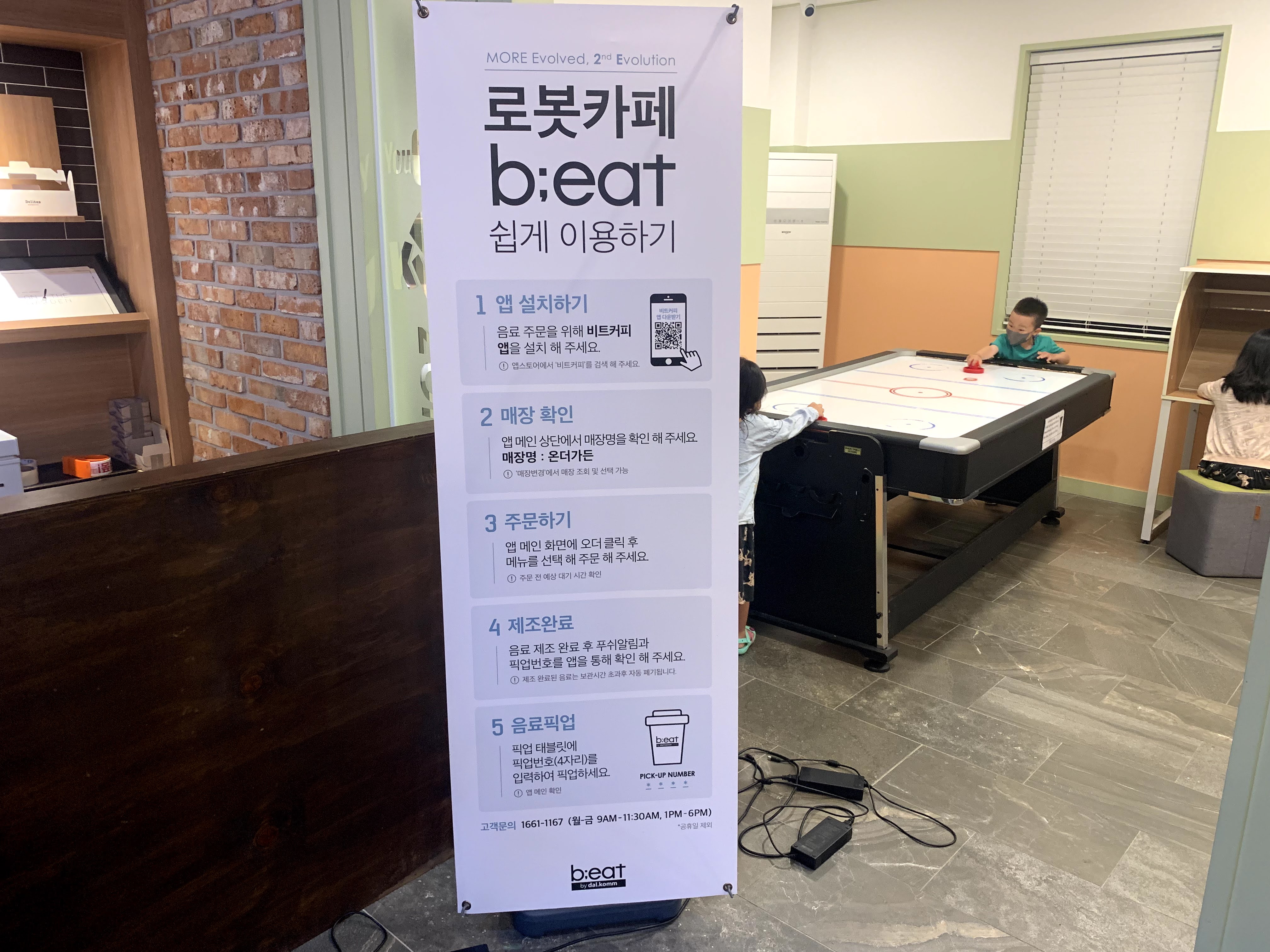 기다리는동안 옆을 둘러보니 요런 안내문이 보입니다. 카페도 로봇으로 운영이 되더라구요. 저희도 어플설치해서 미리 주문을 해놓았습니다. 모든게 스마트하게 운영이 되는 곳이라 군더더기 없이 식사부터 마무리까지 진행이 됩니다.