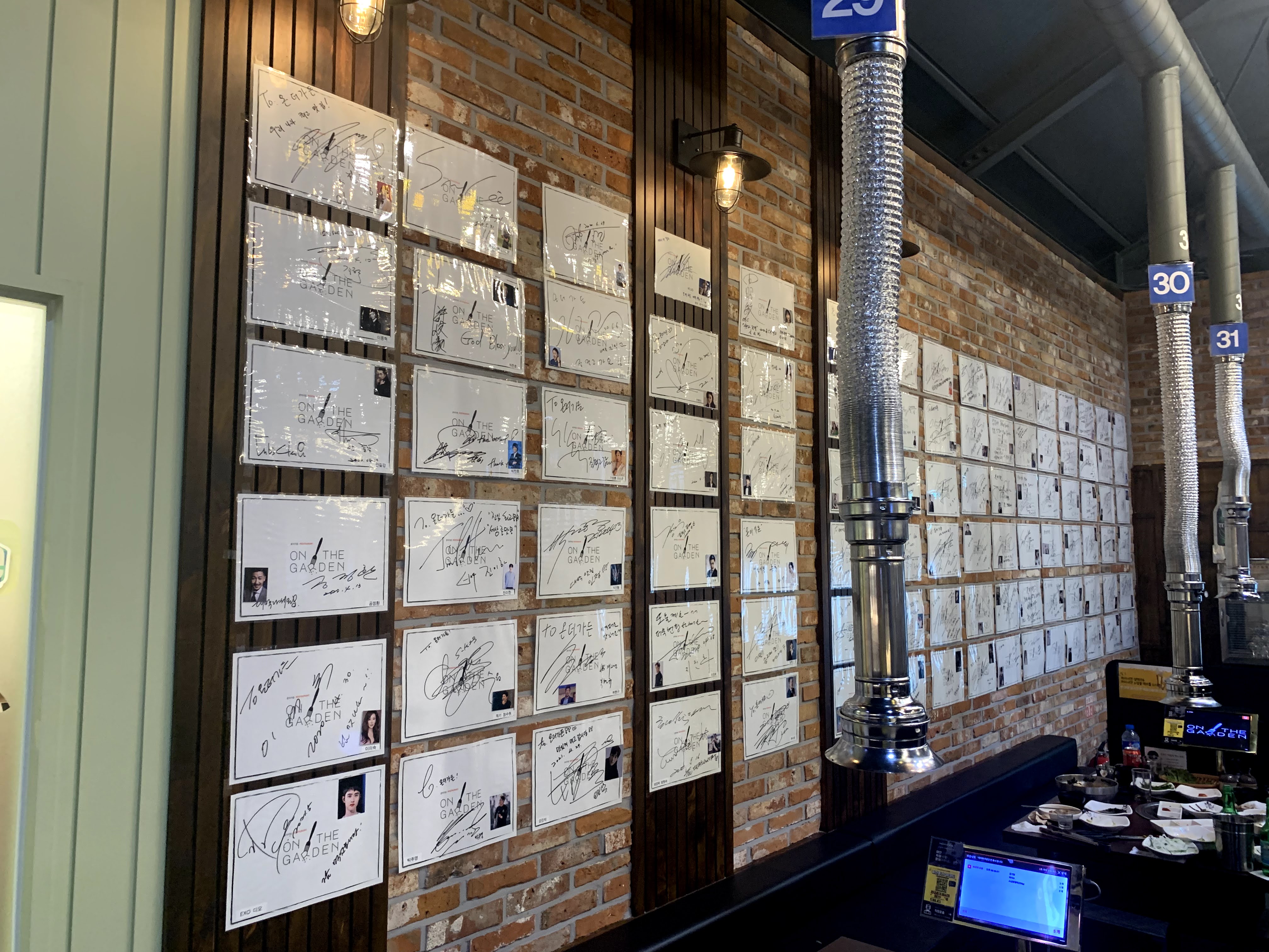 저희가 앉은 자리 뒤쪽벽에 붙은 하얀색종이들이 보이시죠? 이게 모두 연예인이 와서 먹고 남겨놓고 간 싸인들입니다. 여기 온더가든 사장님이 연예계와 관련이 있으신 분이 아닐까 조심스럽게 예상을 해봅니다. 자세히 보니 유명한 연예인들이 아주 많더라구요.