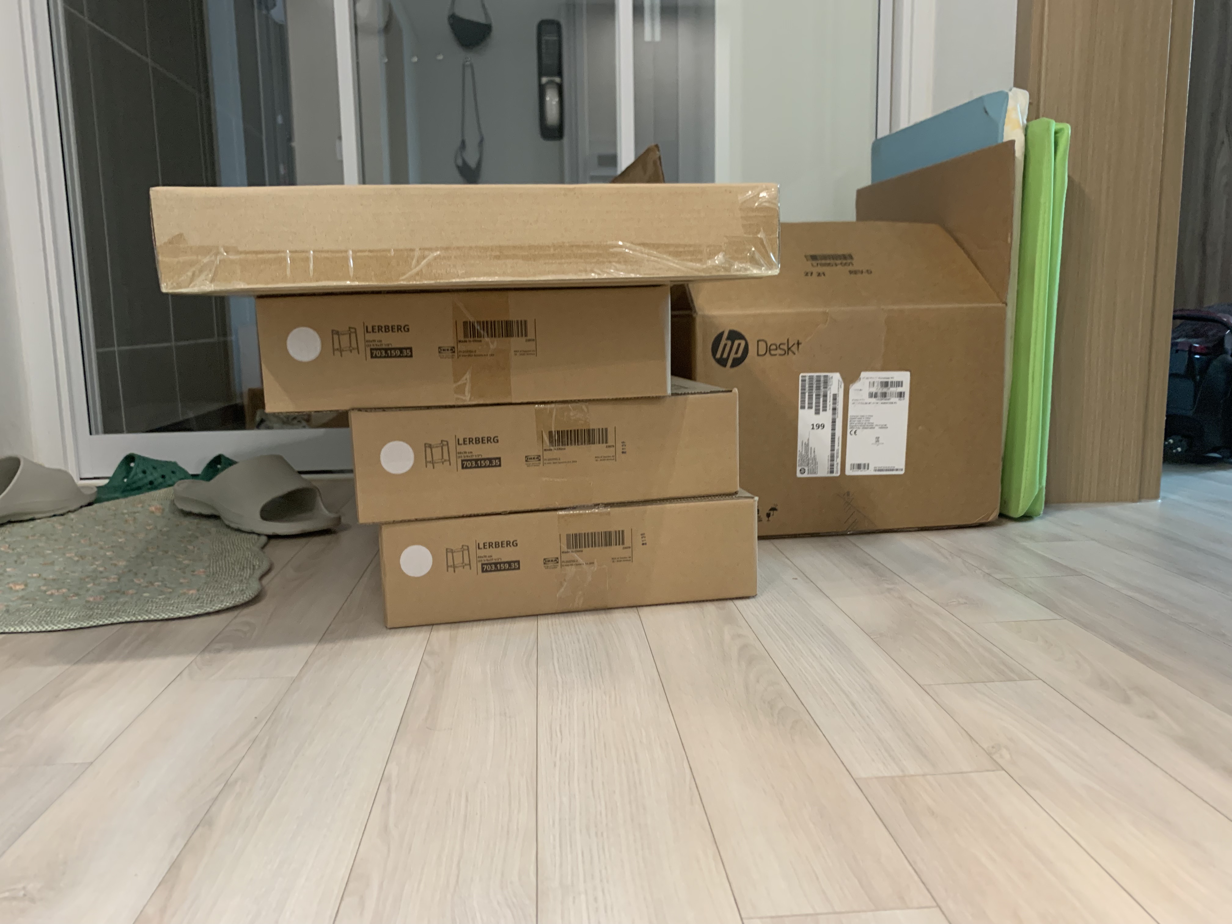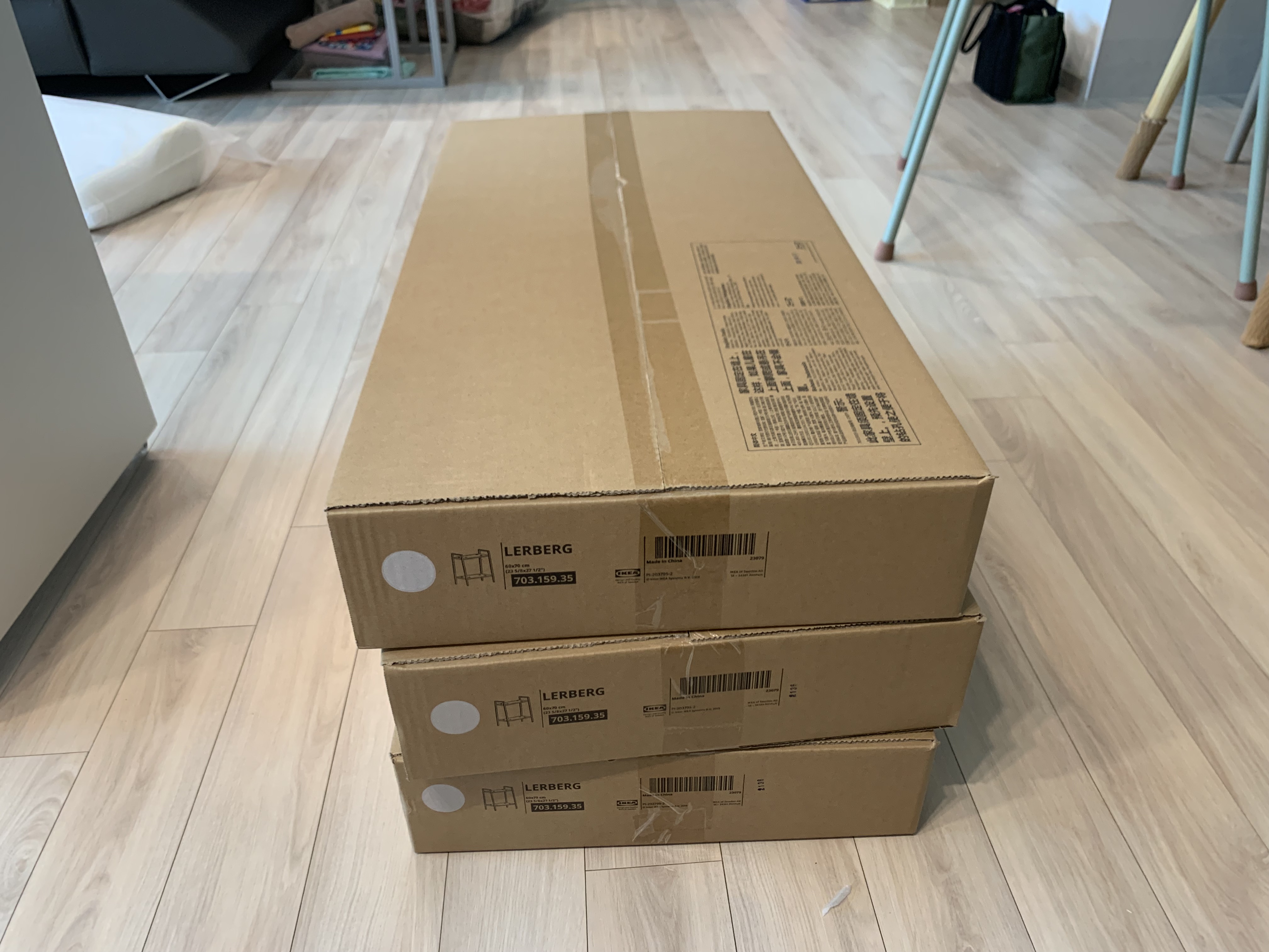 이케아에서 구입해 온 선반과 서랍장 박스입니다. 맨 위에 박스가 서랍장이고 아래3개가 같은종류의 선반입니다.