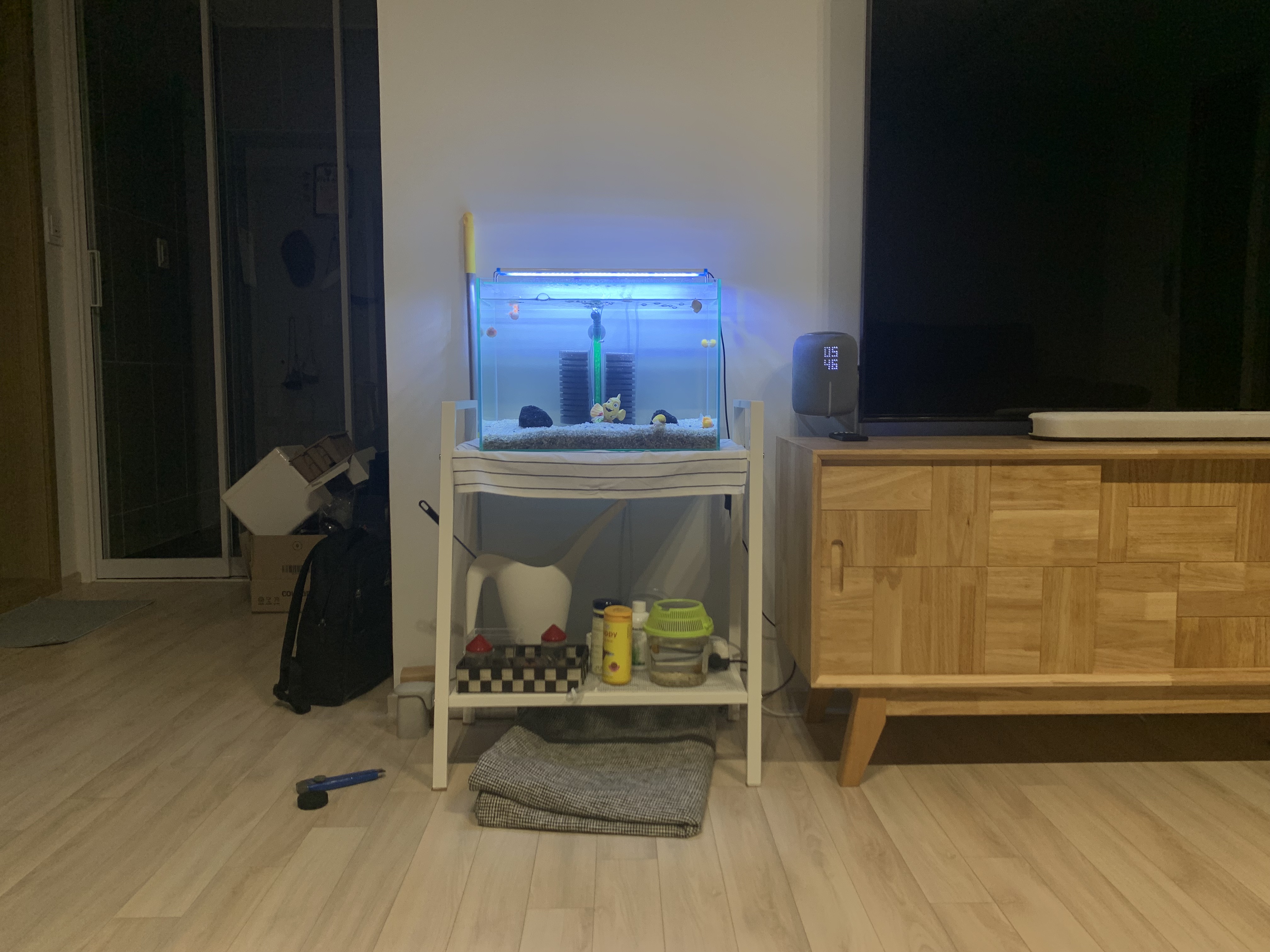 저렴하지만 너무 실용적인 선반을 구입해서 우리집 어항이 자리를 잘 잡았습니다.