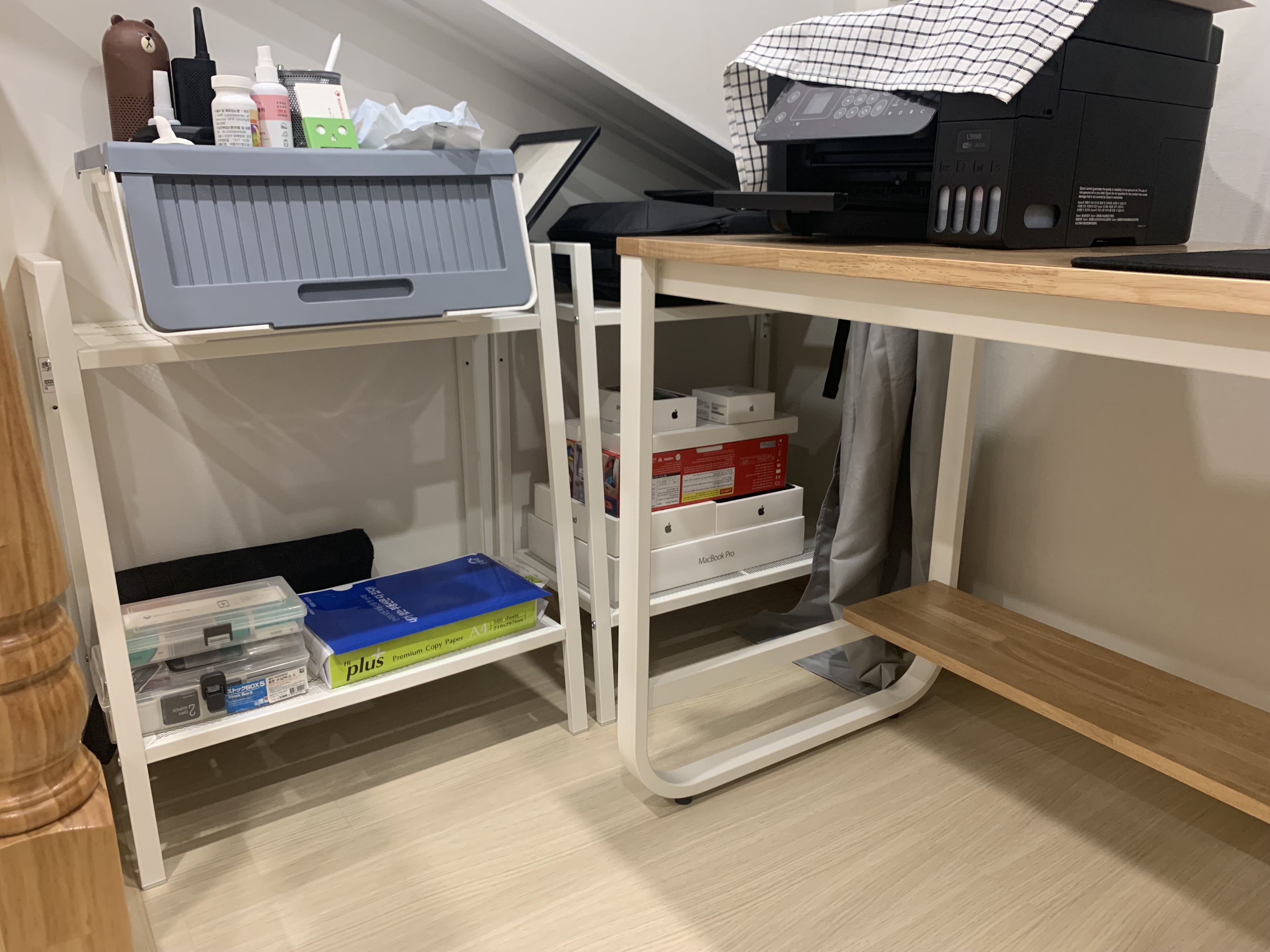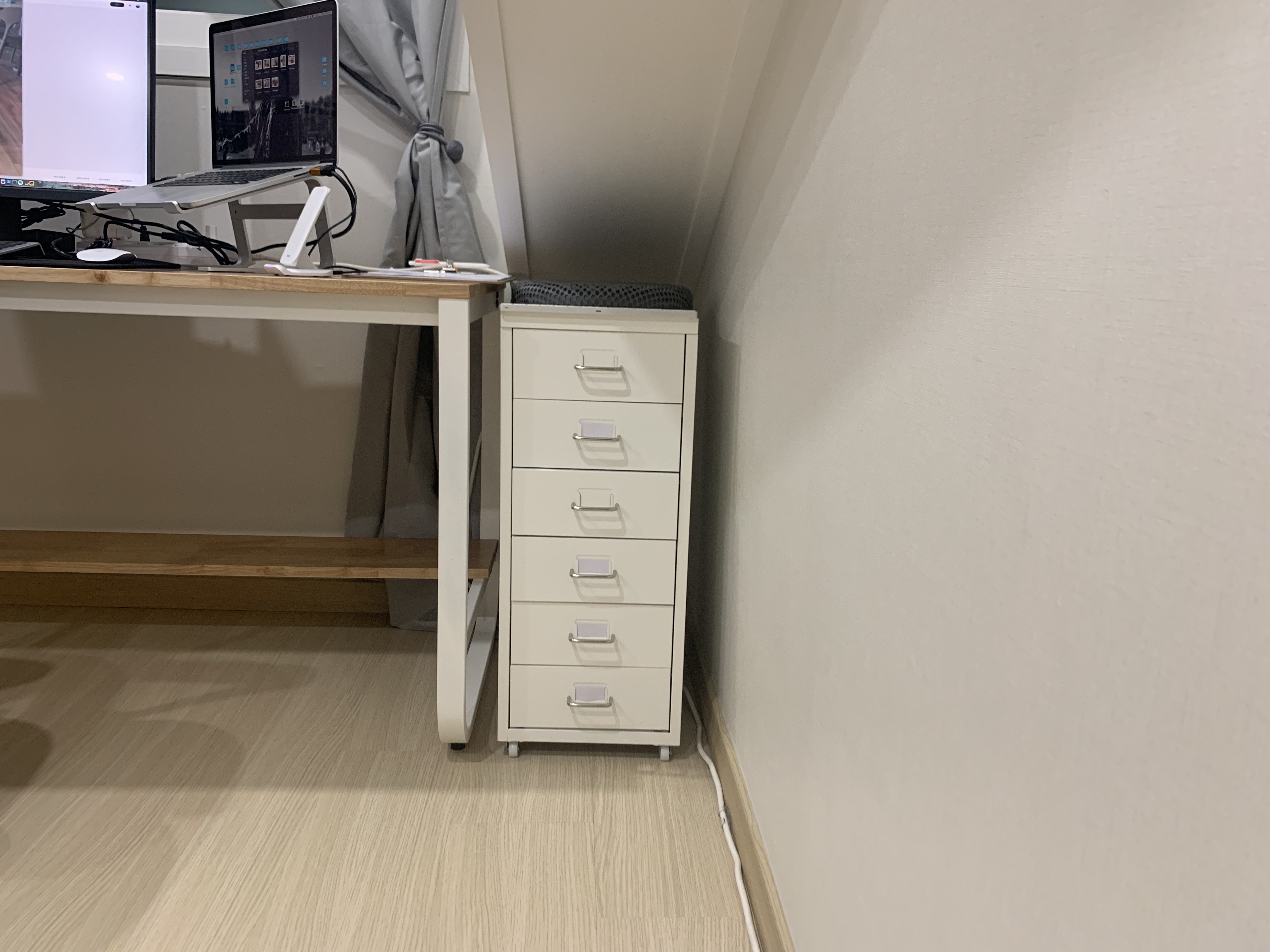 책상의 오른쪽 빈공간에 서랍장을 배치했습니다. 온갖 잡동사니로 채워질 예정입니다. 자리를 아주 잘 잡았습니다.