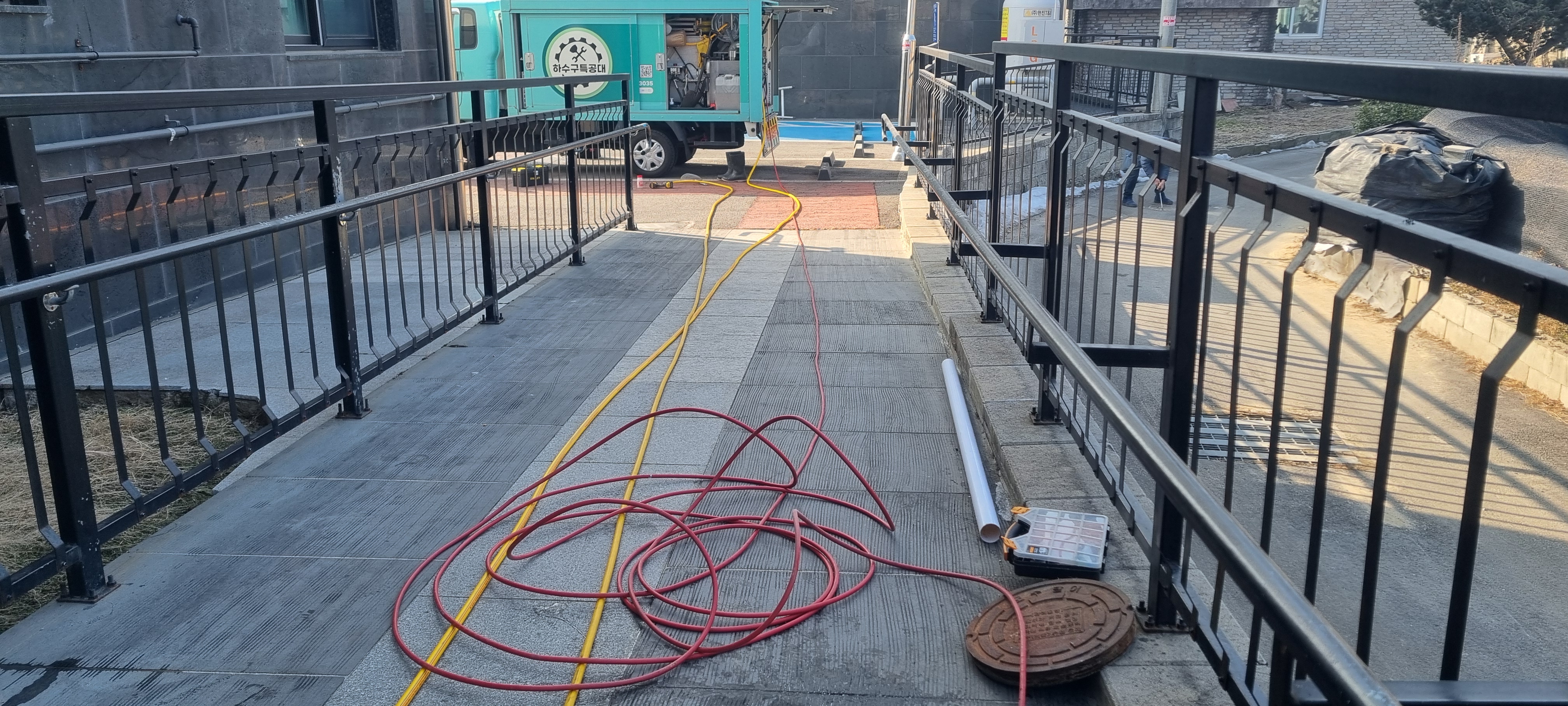이런 경우 가정에서 사용하는 일반 뚫어뻥으로는 해결이 어렵습니다. 전문 장비를 이용한 고압세척이 필요한 상황이었죠.