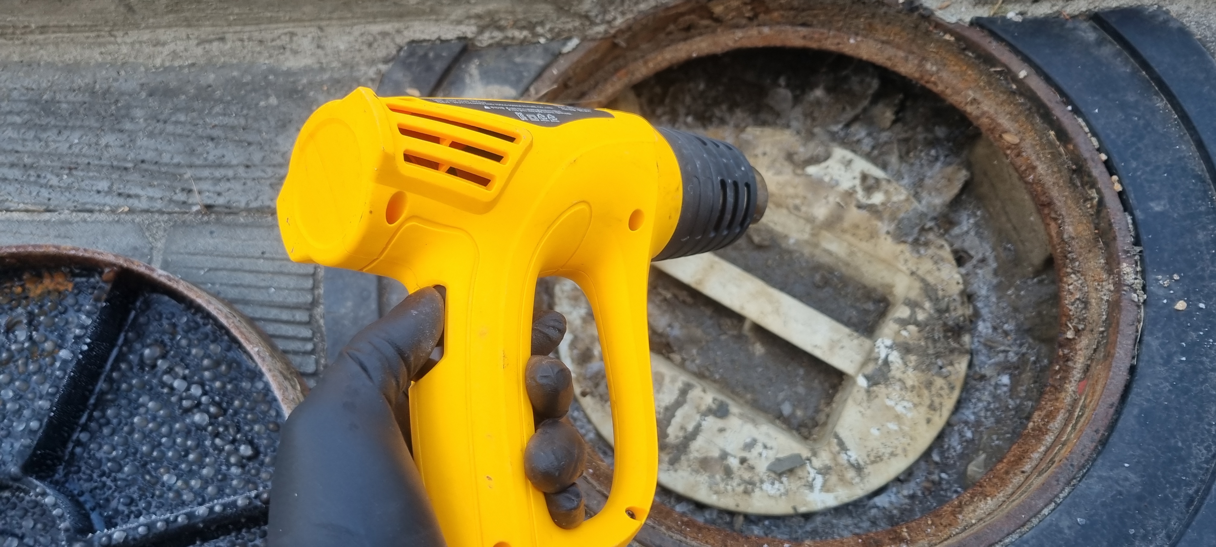 날씨가 추워서 오수받이 뚜껑이 완전히 얼어붙었습니다.