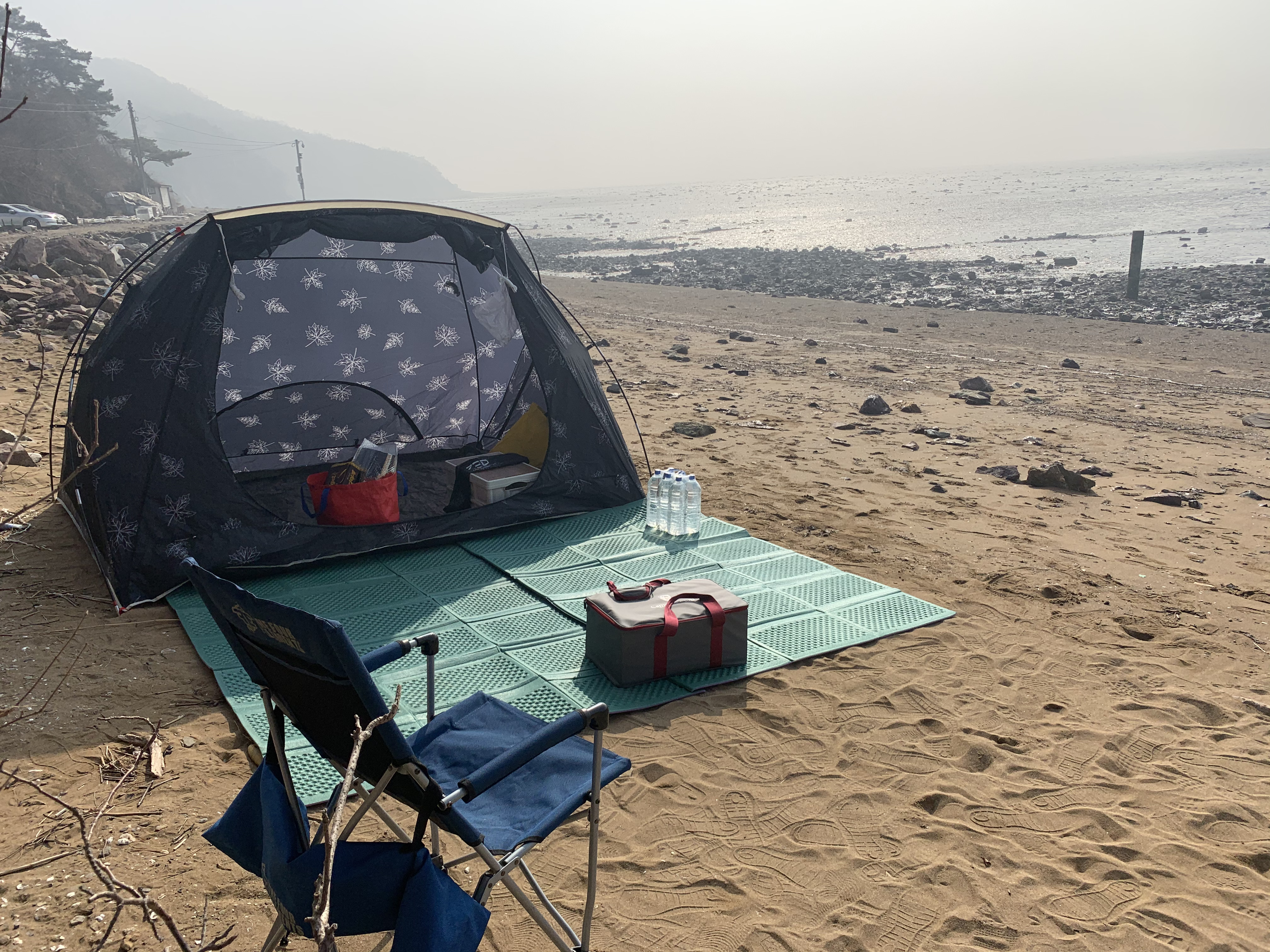 처음엔 대부도 바닷가를 바라보고 그늘막을 설치했는데요. 바람의 방향때문에 위치를 바꿨습니다.