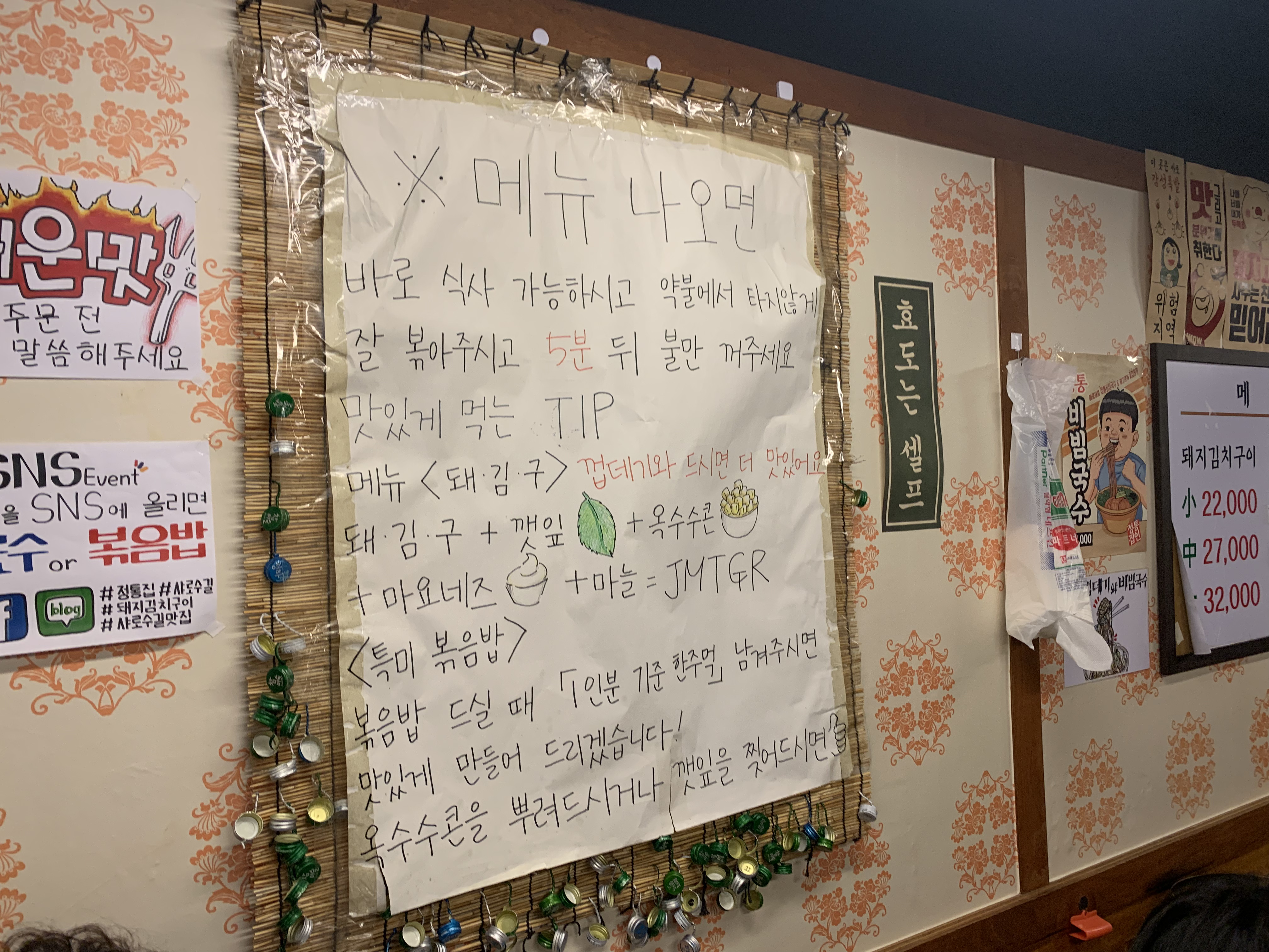 맛있게 먹는 방법이라고 해서 벽에 붙어있는데 차려진 반찬을 모두 때려넣고 먹으면 됩니다. 아주 환상적인 맛입니다.