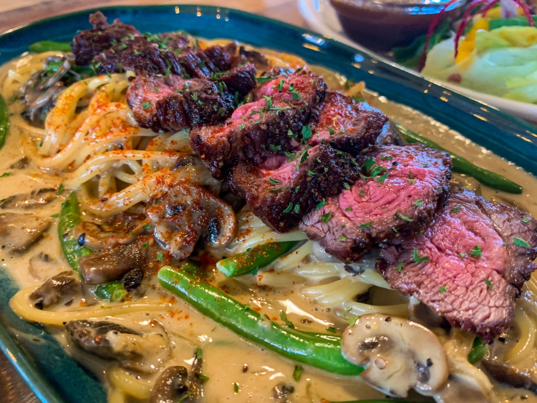 요건 아내가 먹으려고 주문한 스테이크 크림파스타입니다. 고기도 부드럽고 스파게티도 따악 제 스타일이더라구요. 온더키친에서 제일 비싼 메뉴입니다.
