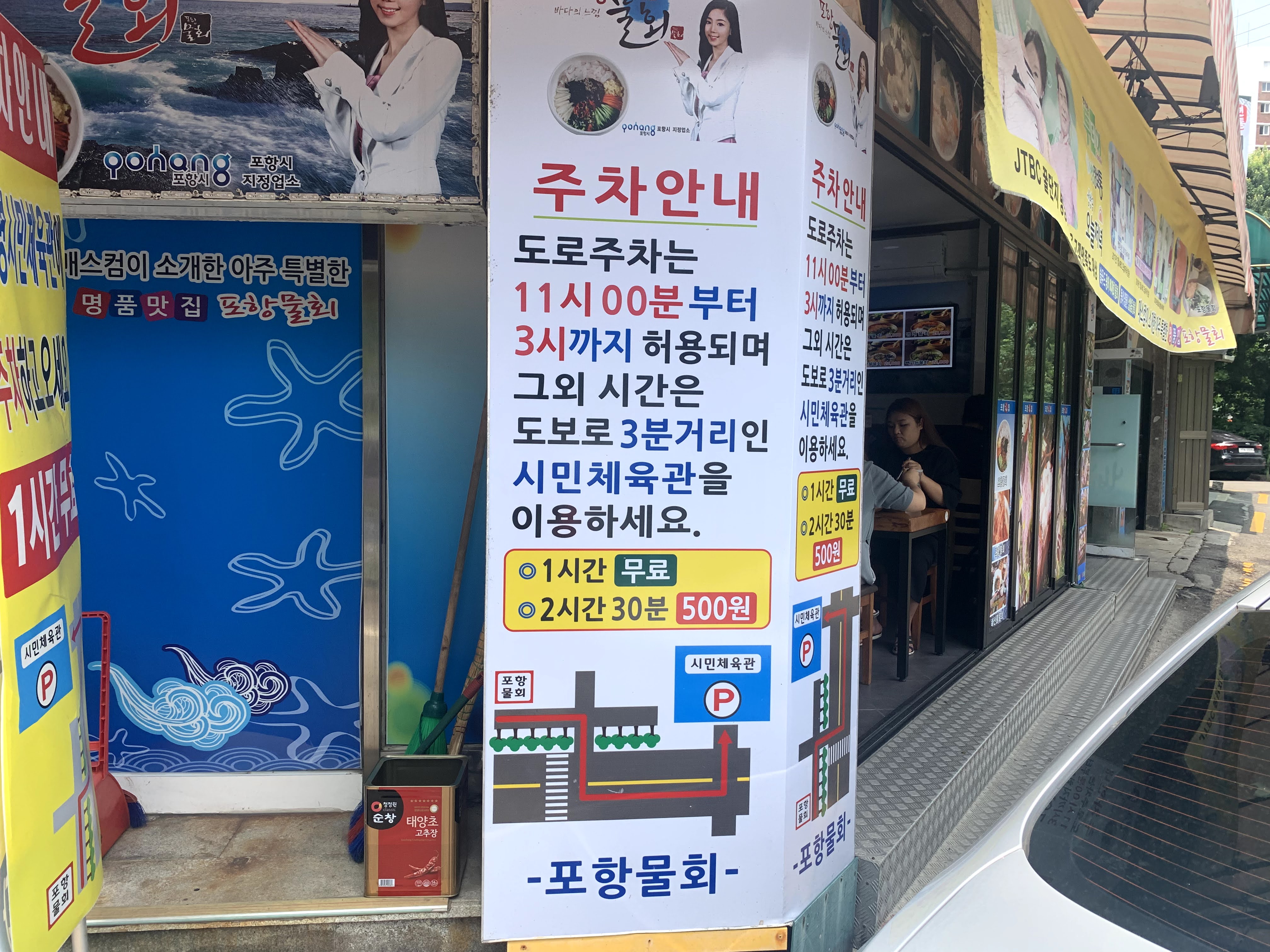간판을 보면 방송에도 많이 나왔던거 같은데요. 저는 친한동생의 소개로 수년전 갔다가 너무 맛있어서 매년 가서 먹고있습니다. 한가지 불편한 점이 주차장이 따로 없다는건데요. 위 사진에서도 보이지만 11시부터 14시까지 도로에 주차가 가능하다고 합니다. 그리고 그외 시간은 도보로 3분거리에 있는 시민체육관을 이용하라고 안내되어 있습니다.