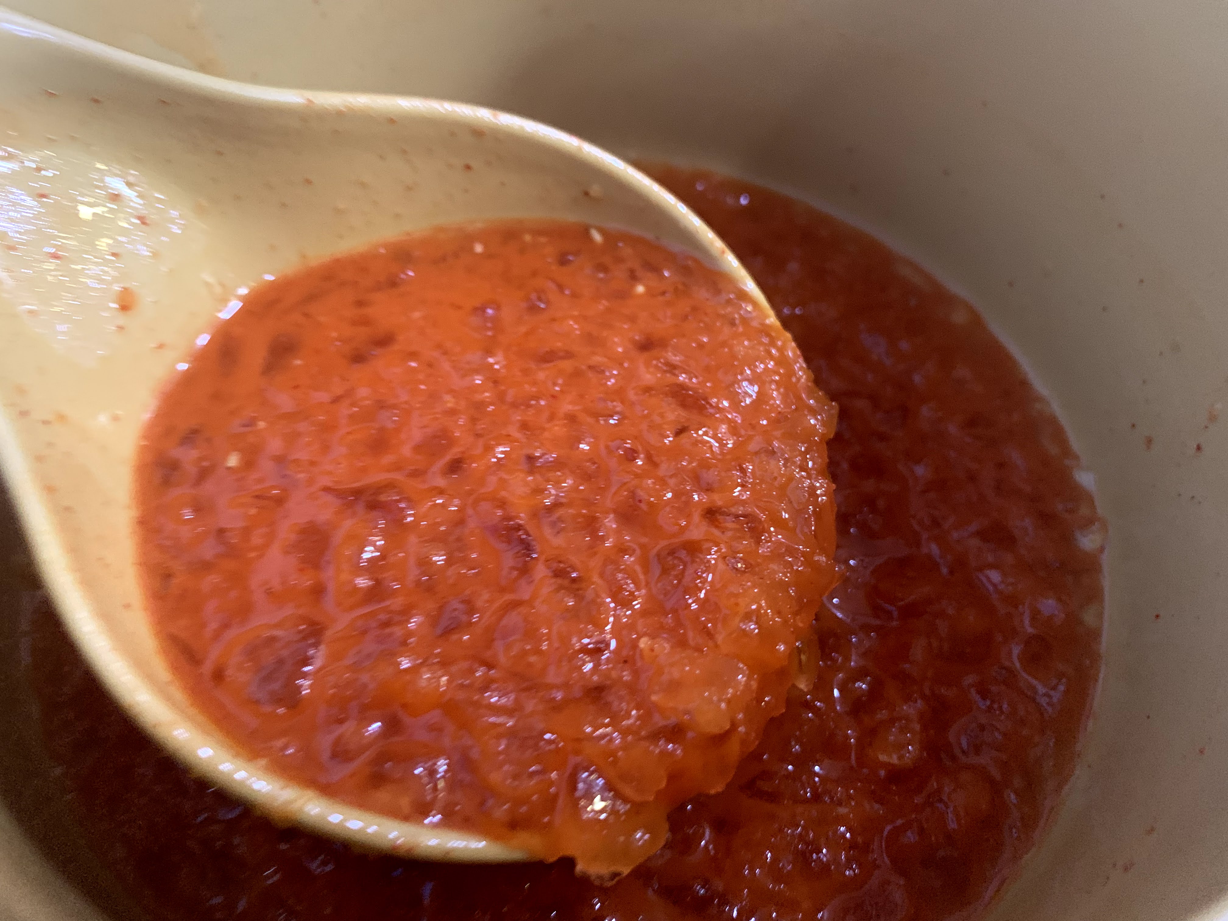 1. 육수1국자를 넣으신 후 반드시 숟가락을 사용하여 생선에 고추장소스가 잘 배어들게 정성껏 버무려 줍니다.