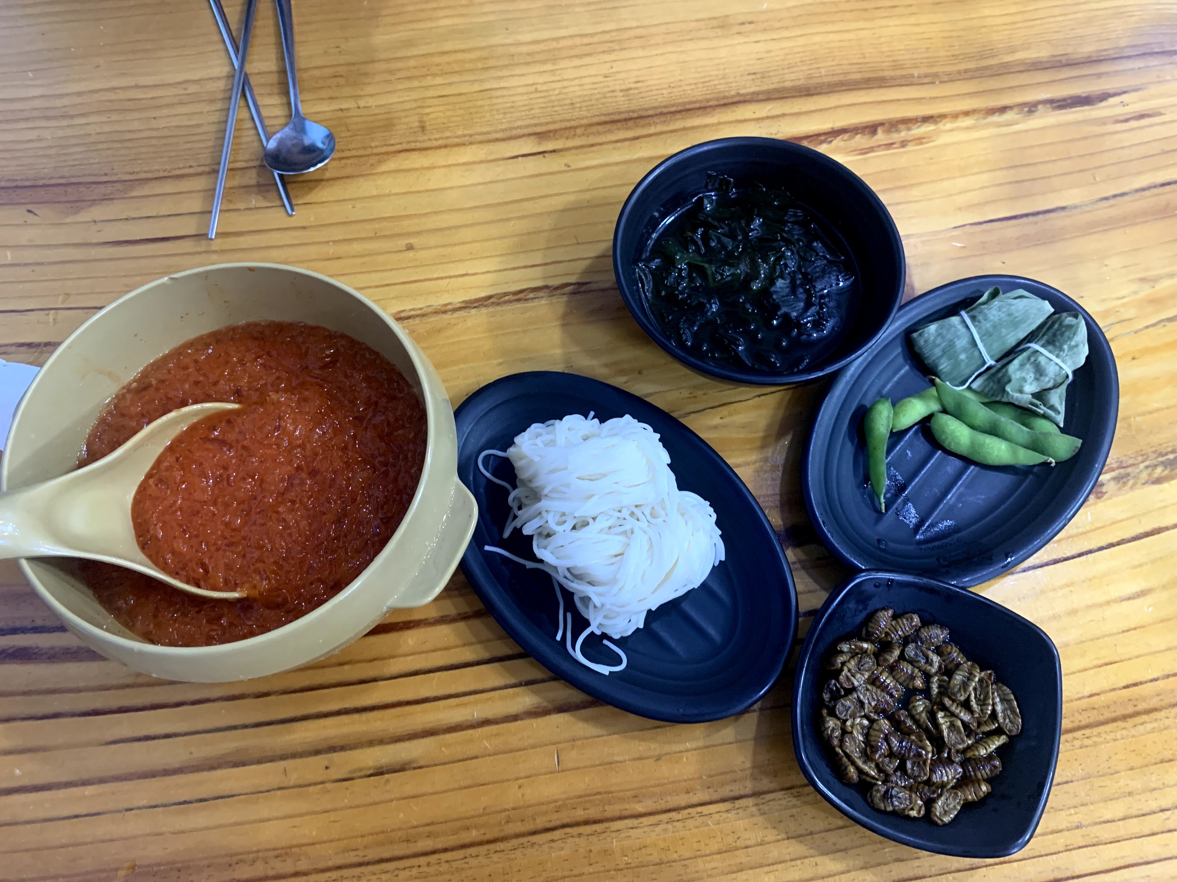 미역국과 번데기, 콩과 찰밥 그리고 소면이 기본적으로 세팅됩니다. 육수에 보이는 얼음이 보이시나요? 시원하고 깊은 육수맛이 일품입니다.